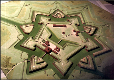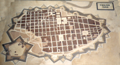 Questo invece è il modello della Cittadella, di Torino al tempo dell'assedio del 1706, quando i francesi ceracrono per alcuni mesi di espugnarla e di impadronirsi della città. In quell'occasinoe si verificò l'episodio di Pietro Micca che preferì saltare in aria facendo esplodere l'ingresso di una galleria chesalvarsi e lasciare via libera ai nemici. Torino fu salvata dal principe Eugenio di Savoia Soissons, generale dell'Impero Asburgico che sconfisse i franco spagnoli (allora chiamati gallo ispani) nella battaglia di Torino del 6 settembre 1706.